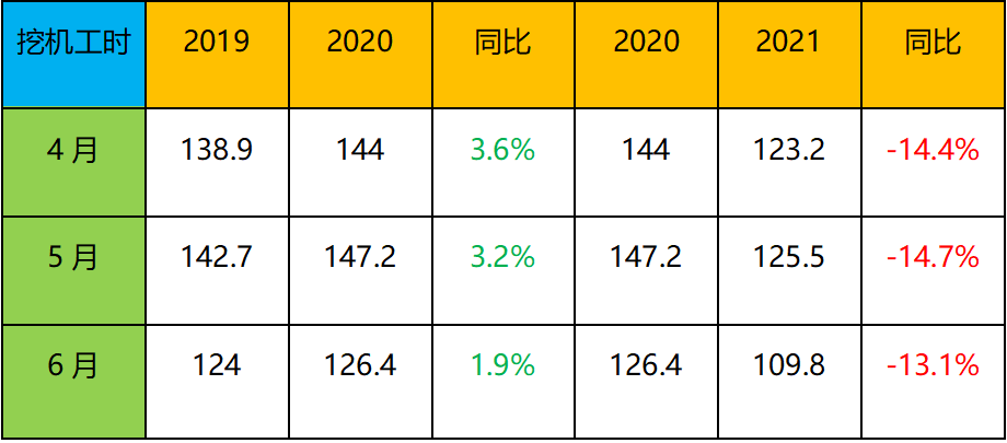 通过观察表1信息,我们可以发现2021年4月至6月,每个月的挖掘机工作时长同比降幅较大,均超过了10%。