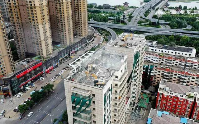 牛!洛阳4台挖掘机攀爬到60米高楼顶施工作业