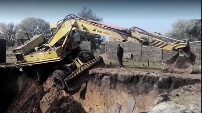 上坡猛抬大臂?挖掘机这下摔得够惨!